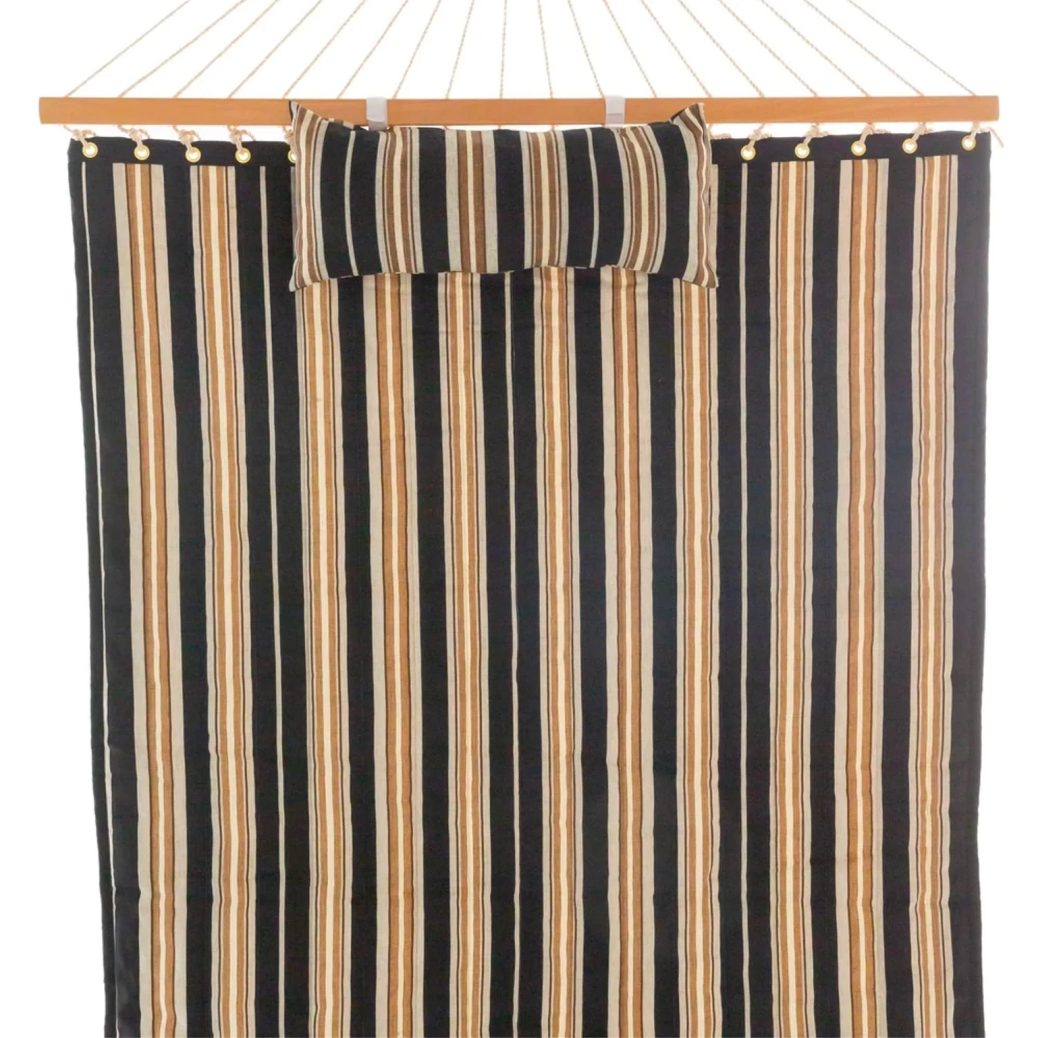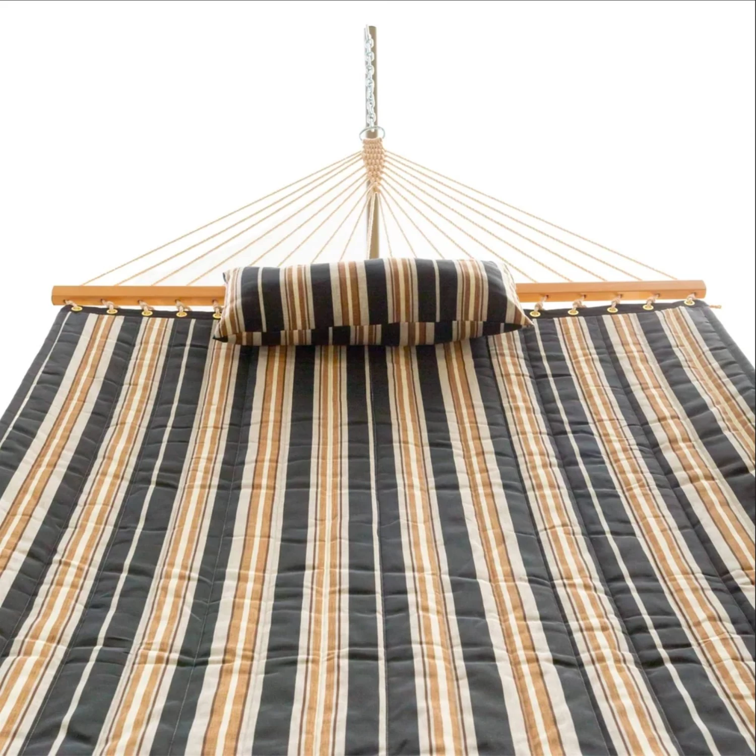 - Durable Spreader Bars: Unlike brazilian style fabric hammocks, our quilted hammock with hardwood spreader bars keeps the hammock bed spread out for you to experience true relaxation without being wrapped in fabric! Each hardwood spreader bar is sanded and varnished to reveal the wood’s natural beauty while withstanding the elements.