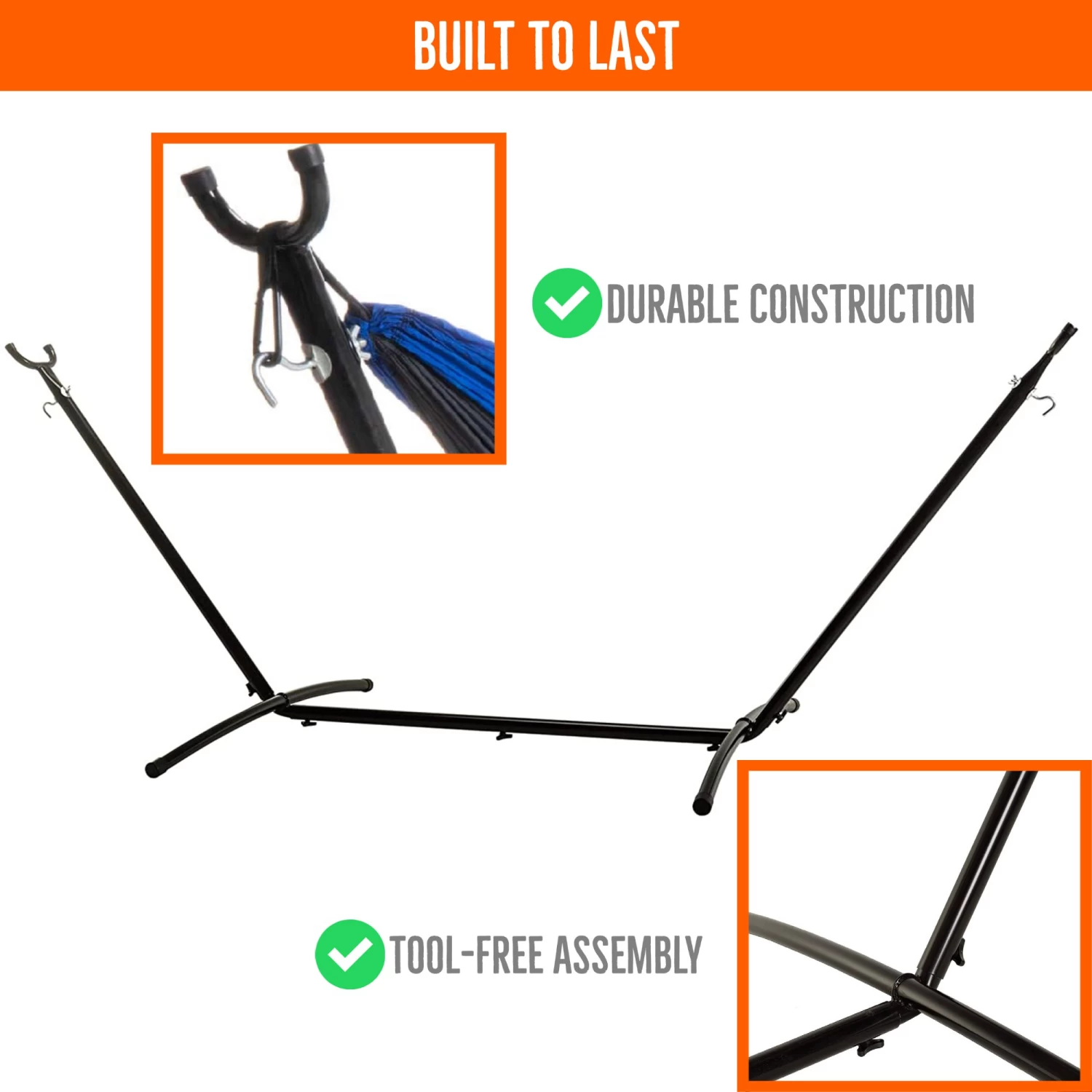 - Space Saving Stand: The space saving hammock stand is the perfect addition to any or even to bring along with you on an excursion! The stand outperforms all other stands on the market with it’s compact yet durable design. Each stand is constructed of steel tubing that is powder coated to extend the lifespan of the stand while providing a recommended 400 pound weight capacity.