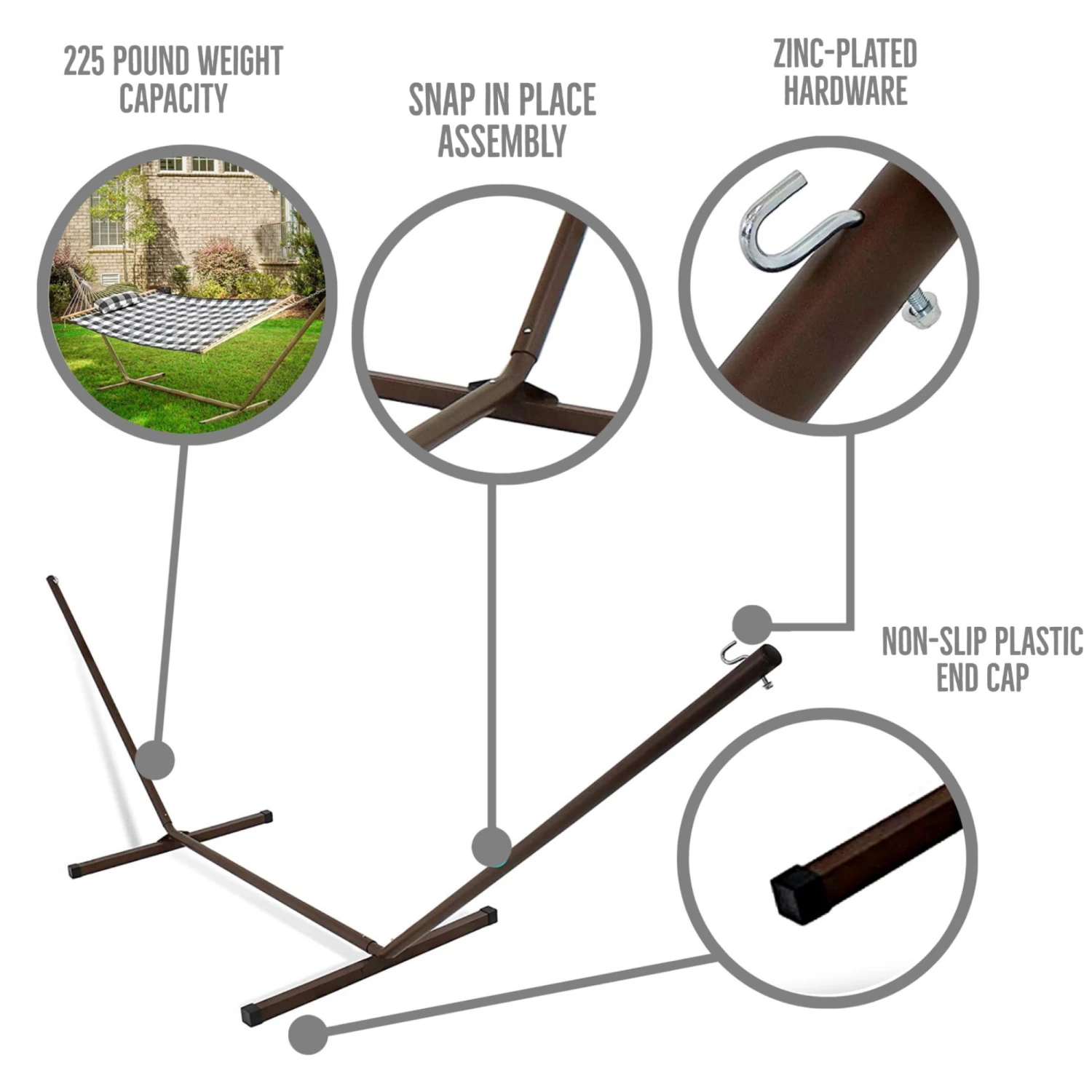 - Space Saving Stand: The PATENTED KD hammock stand is the perfect addition to any outdoor space or even to bring along with you on an excursion! The stand outperforms all other stands on the market with it’s compact yet durable design. Each stand is constructed of steel tubing that is powder coated to extend the lifespan of the stand while providing a recommended 300 pound weight capacity. Assemble or disassemble with NO TOOLS REQUIRED in just minutes with it’s snap in place mechanisms.