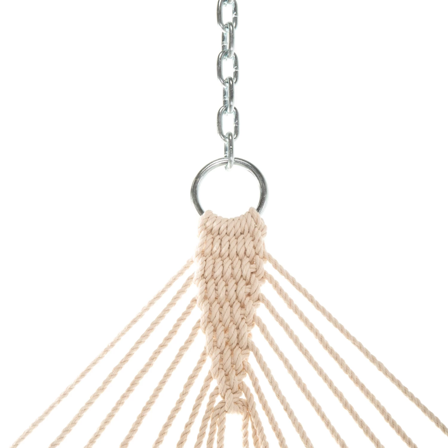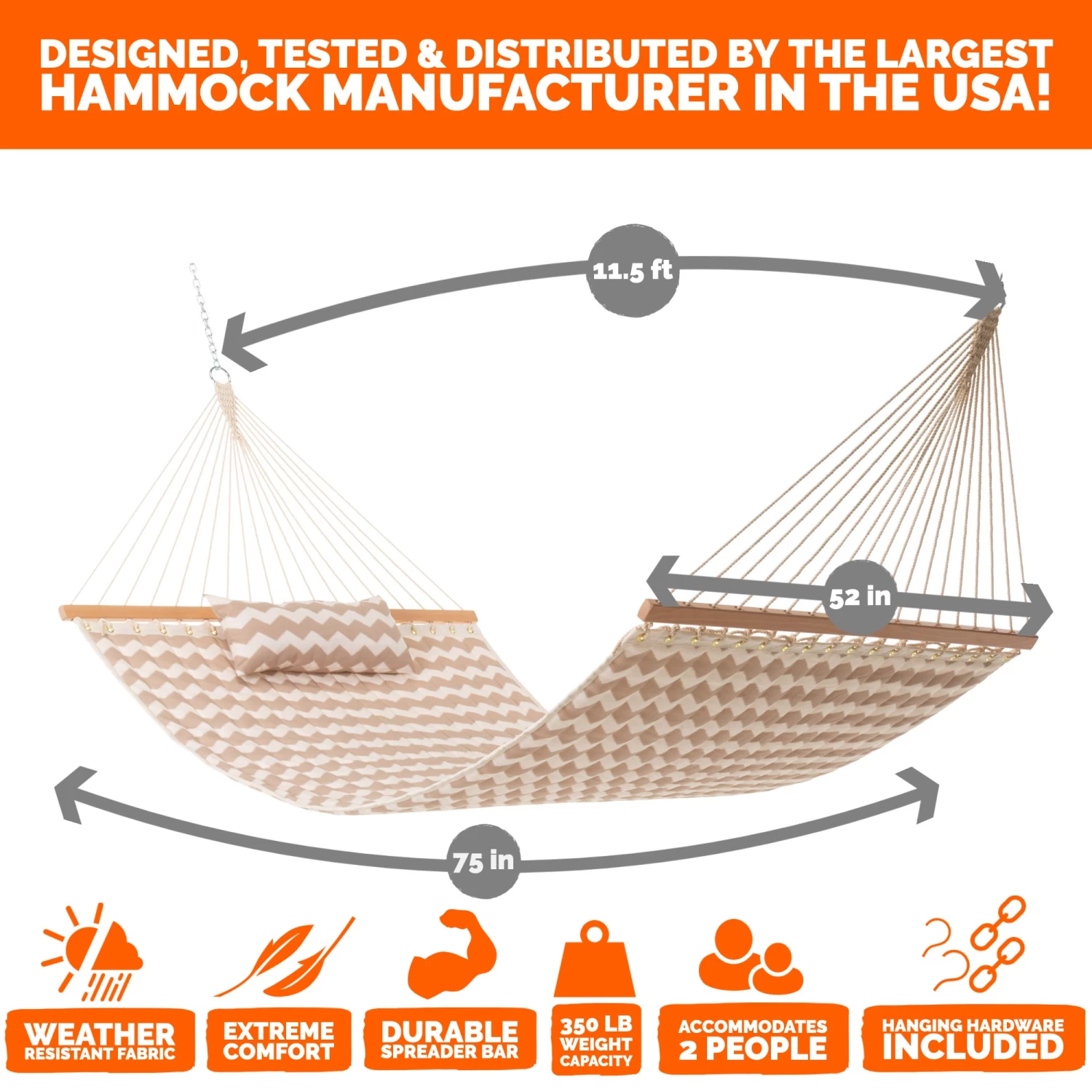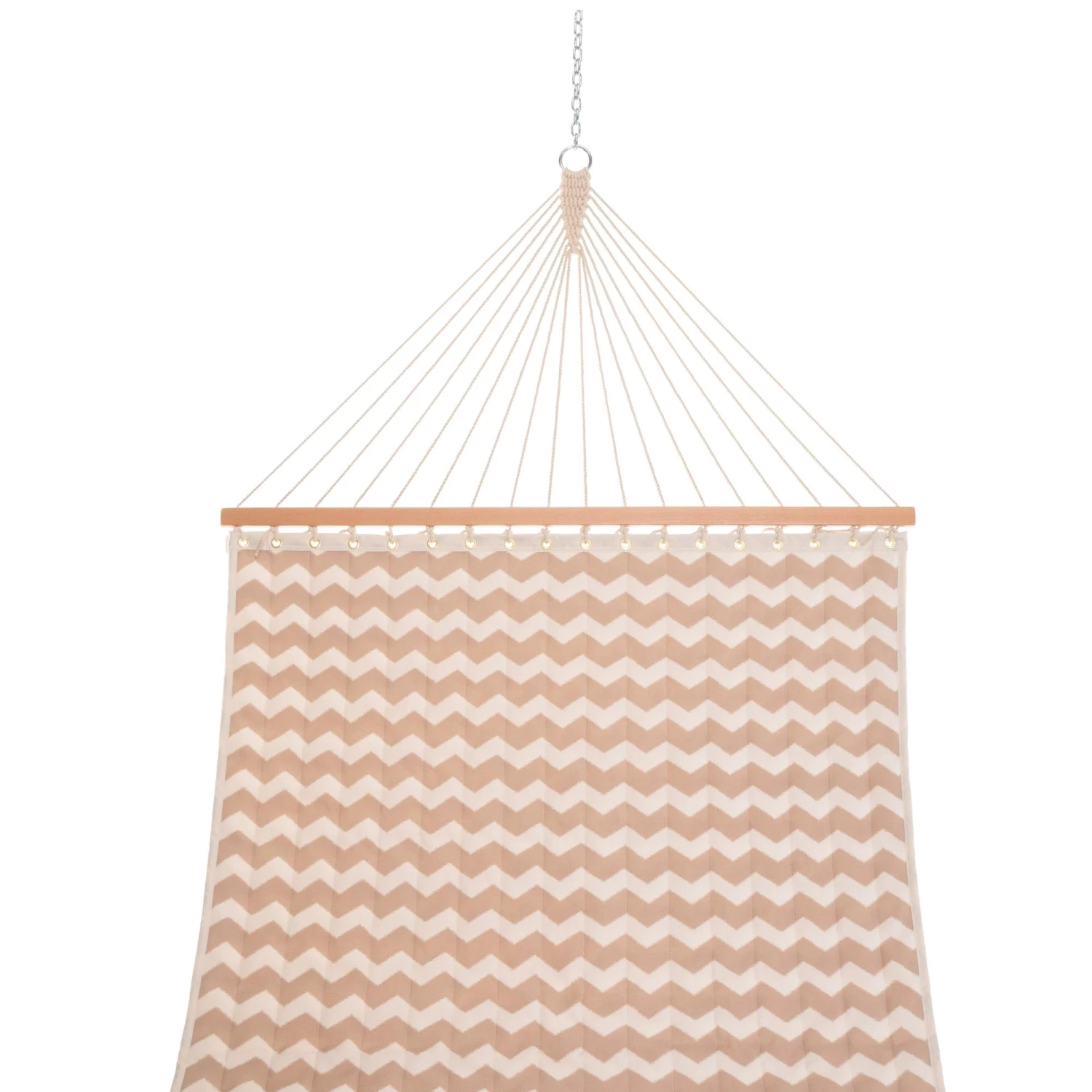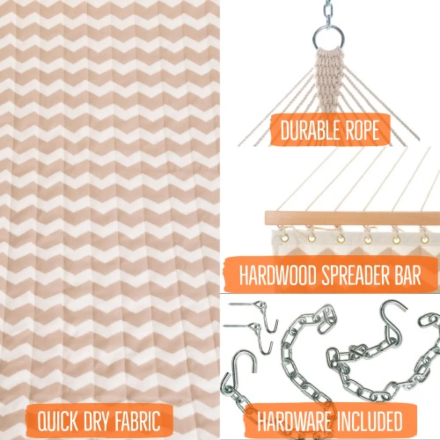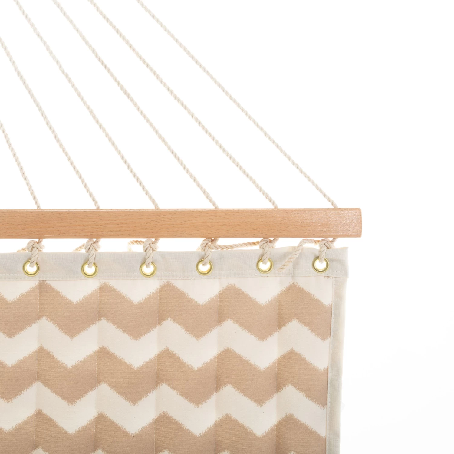 - Durable Spreader Bar: Unlike brazilian style fabric hammocks, this quilted hammock with hardwood spreader bars keeps the hammock bed spread out for you to experience true relaxation without being wrapped in fabric! Each hardwood spreader bar is sanded and varnished to reveal the woodās natural beauty while withstanding the elements.