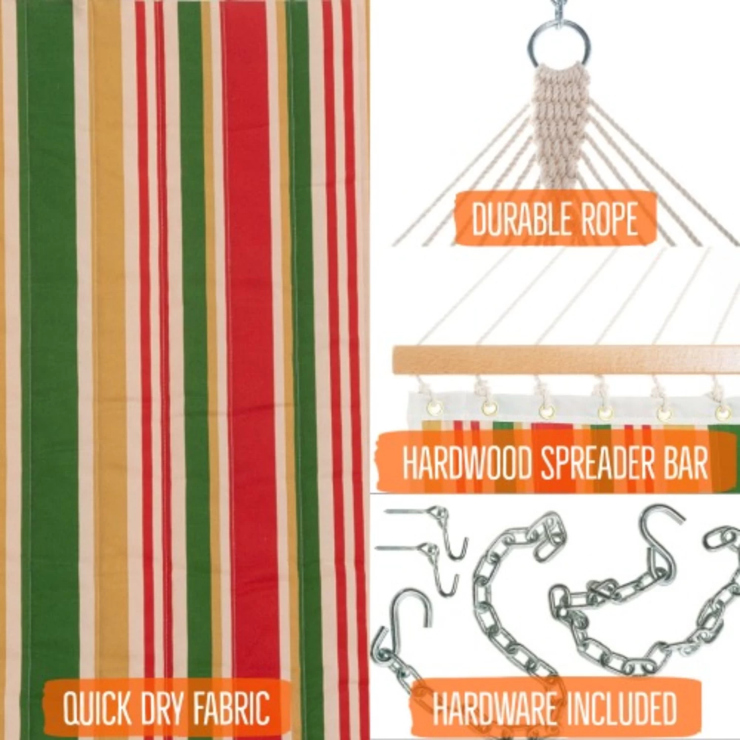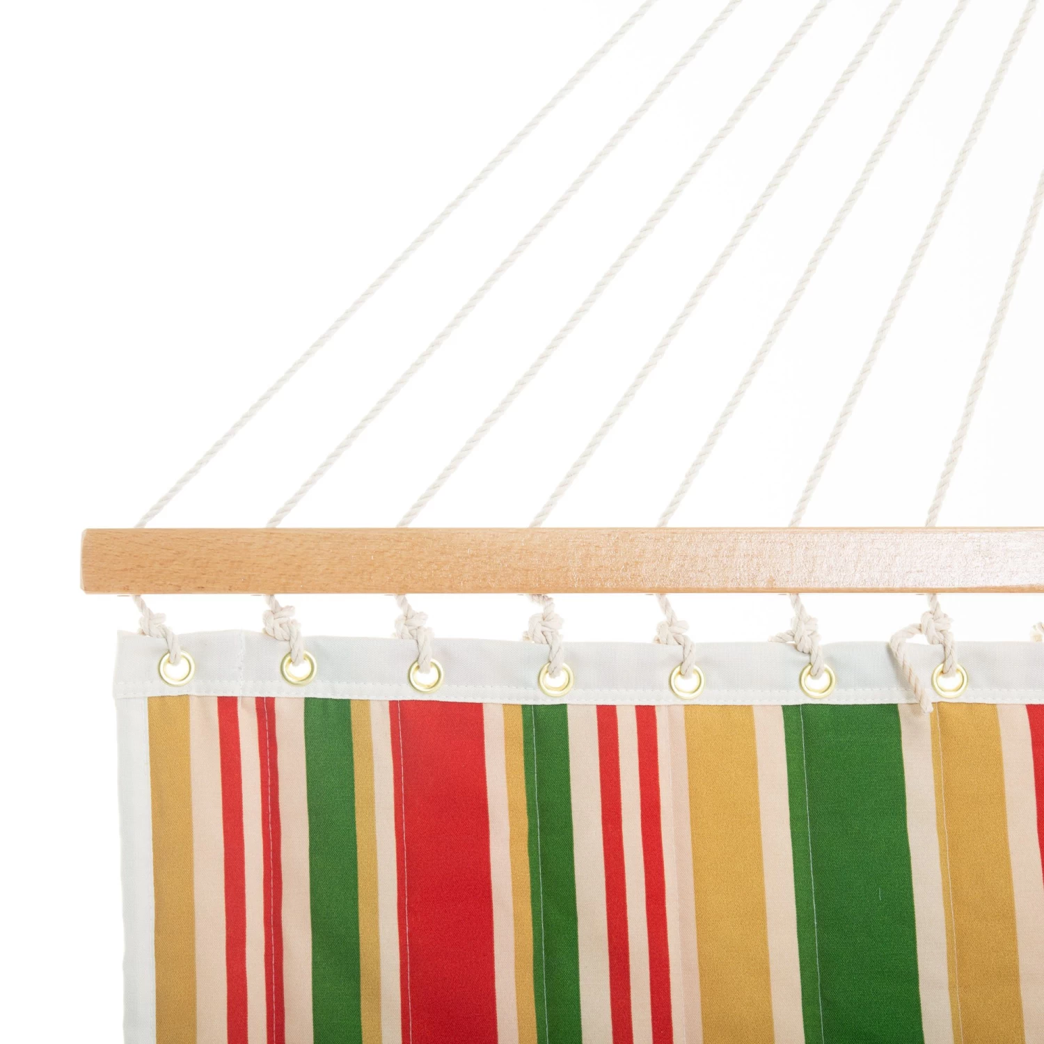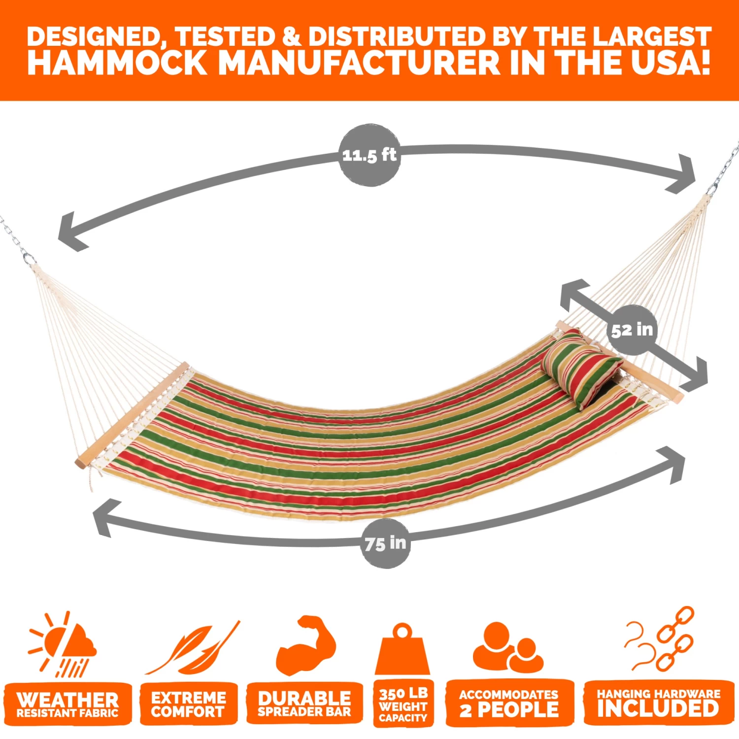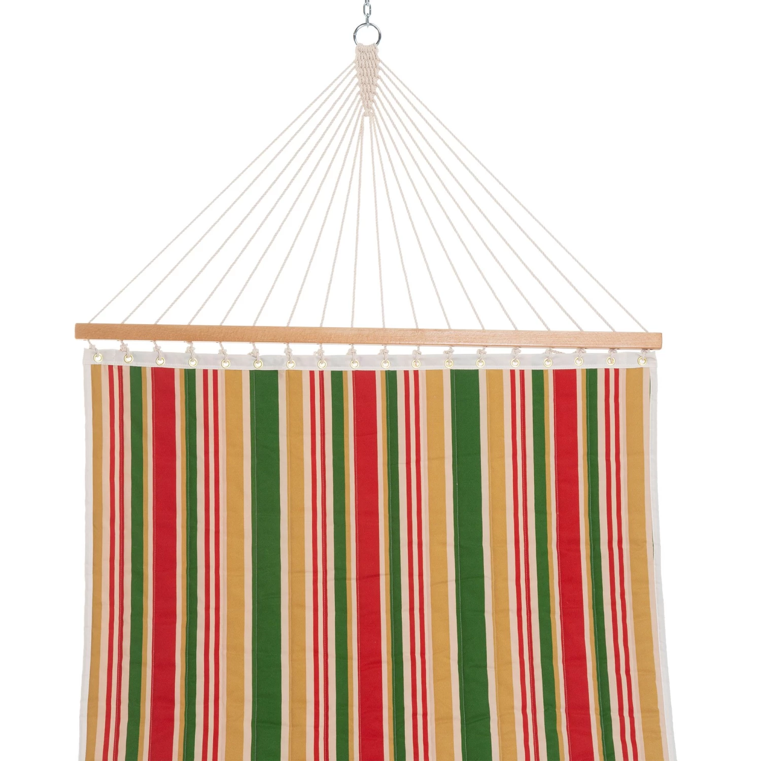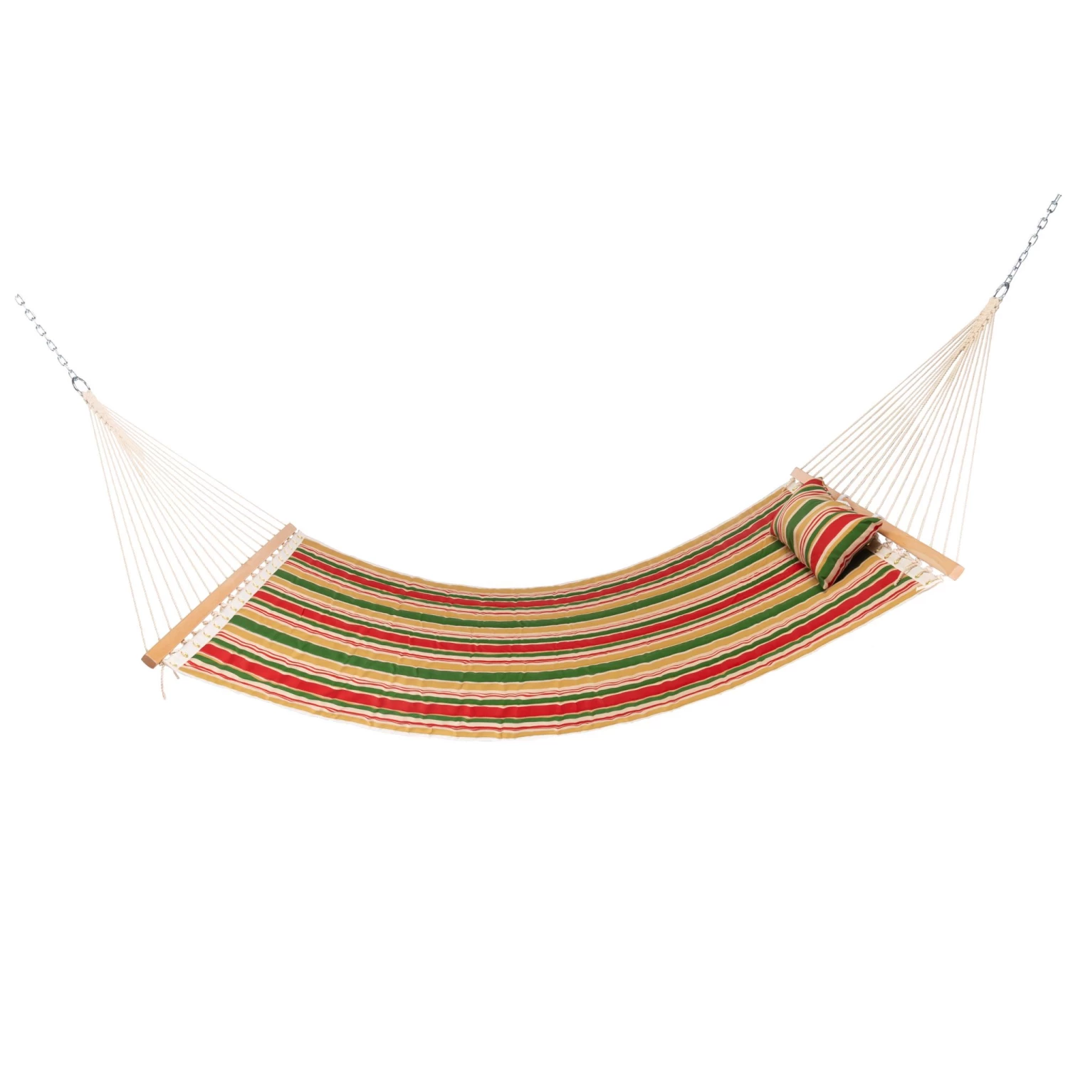- Durable Spreader Bar: Unlike brazilian style fabric hammocks, this quilted hammock with hardwood spreader bars keeps the hammock bed spread out for you to experience true relaxation without being wrapped in fabric! Each hardwood spreader bar is sanded and varnished to reveal the wood’s natural beauty while withstanding the elements.