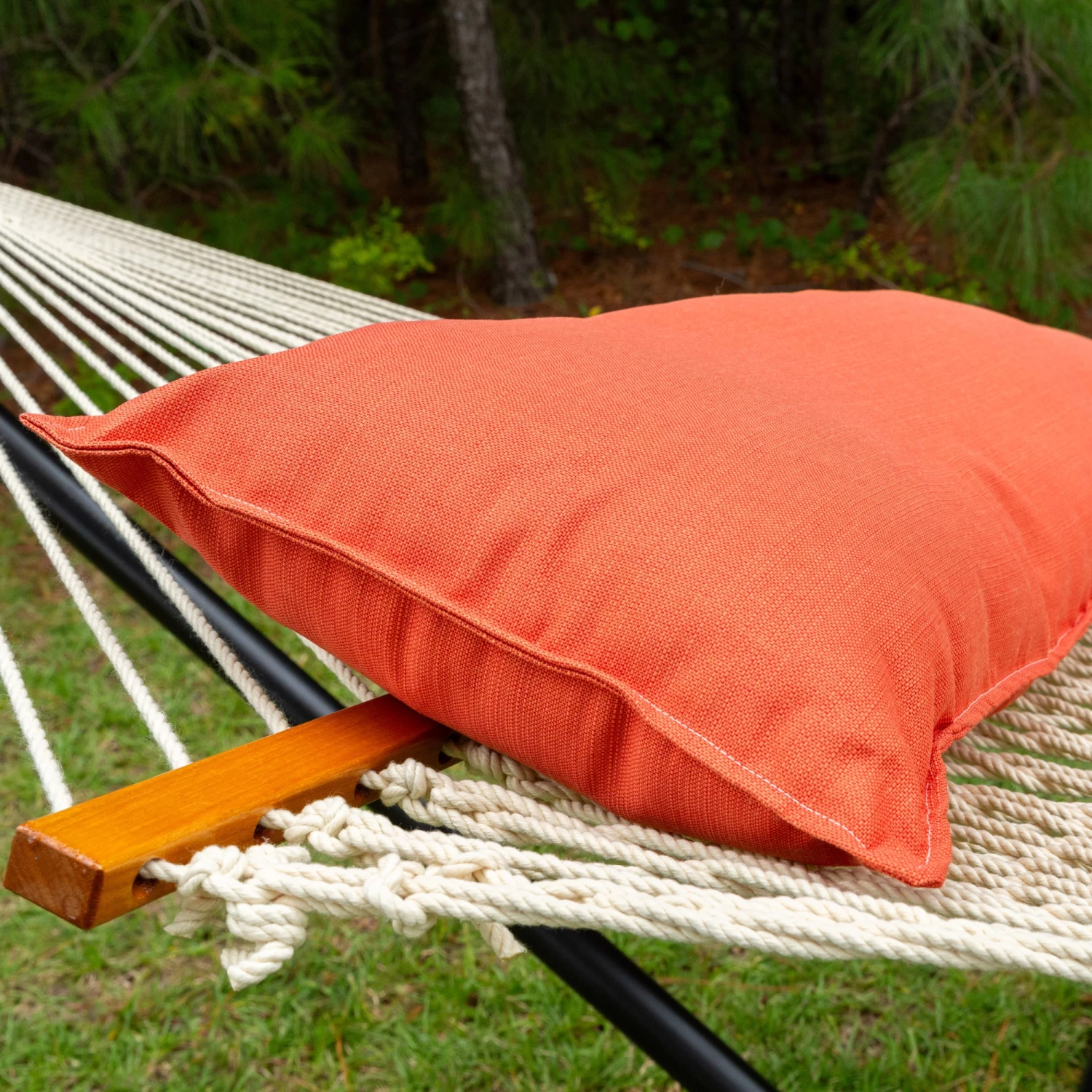 - Hook-and-Loop Fasteners: Sewn on the reverse side of the pillow to attach to the spreader bar of the hammock. Ideal to prevent the pillow from blowing away.